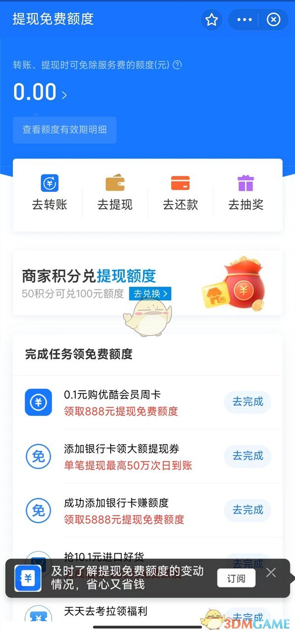 2、參與提現(xiàn)免費額度小程序的活動并完成相關任務后,用戶可以領取免費的提現(xiàn)額度。