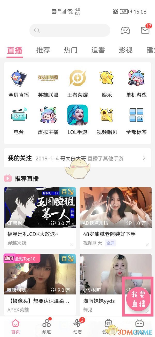 1、首先,打開嗶哩嗶哩APP,進入“直播”頁面后,點擊右下角的【我要直播】按鈕。