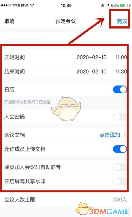2、輸入相關會議內(nèi)容后,點擊右上角的“完成”按鈕。