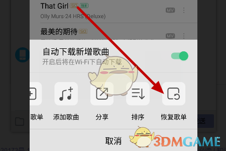 3、在彈出的菜單中,選擇“恢復(fù)歌單”功能。