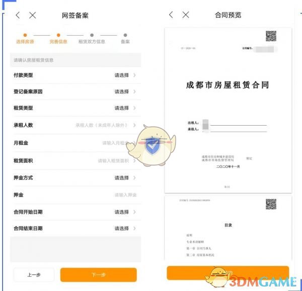 3、接下來填寫房屋租賃的相關(guān)信息,包括備案原因、租金、承租人及實際居住人信息、合同時間等。填寫完畢后,可以預覽合同,確認無誤后點擊“簽約”進入網(wǎng)上簽約環(huán)節(jié)。