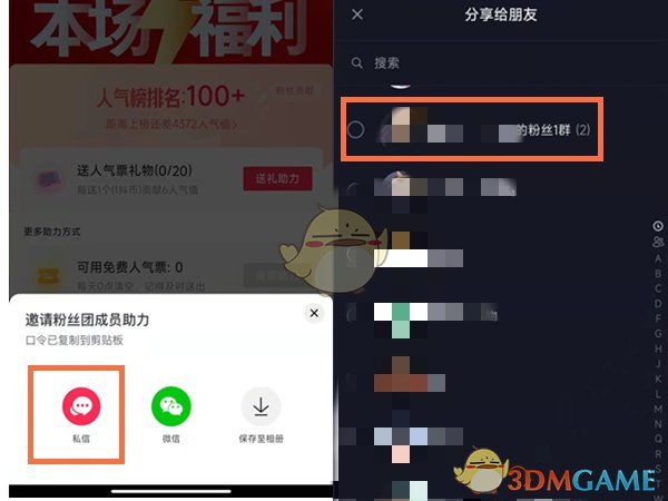 4、接下來,選擇私信方式,再勾選粉絲團群組,最后點擊“確定”即可完成邀請。