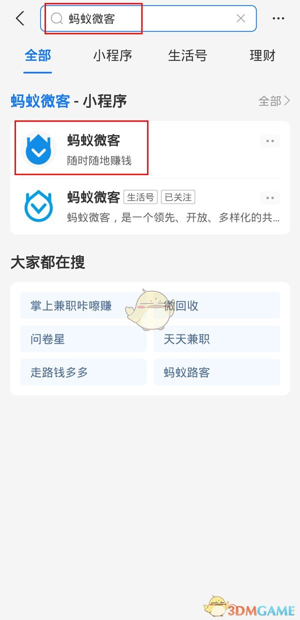 1、首先,打開支付寶應用,在搜索框內輸入“螞蟻微客”,點擊進入該小程序。