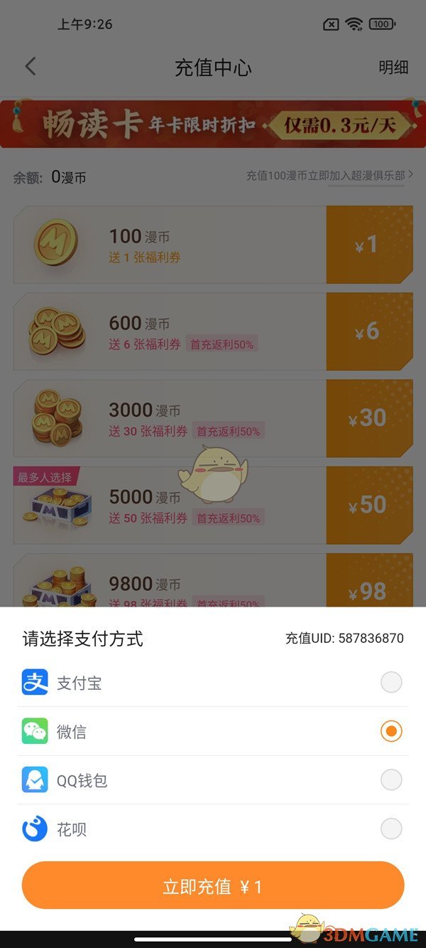 2、選擇你希望充值的金額,并按照系統(tǒng)提示選擇支付方式,完成支付后即可成功充值漫幣。