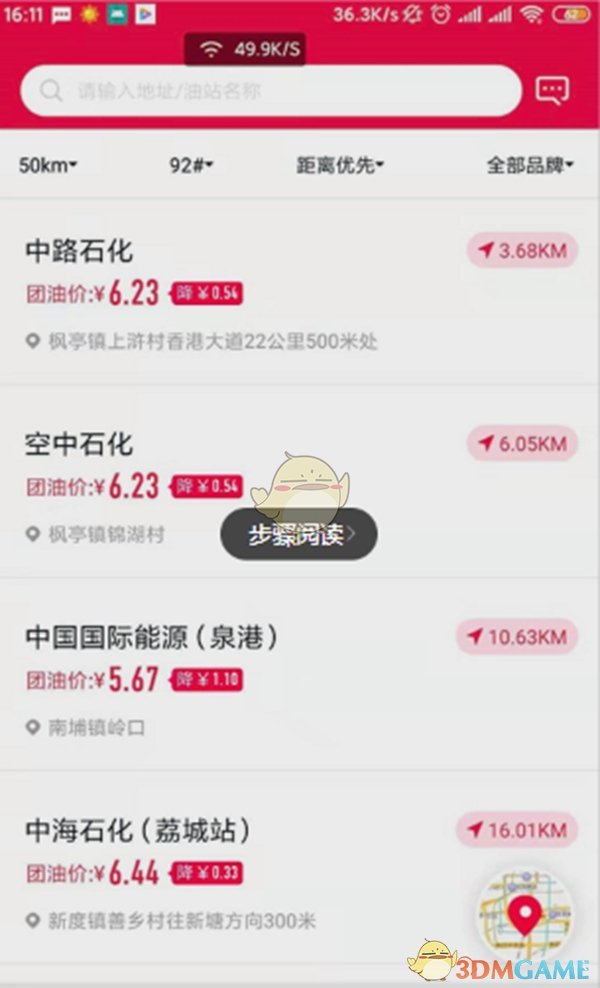 2、在選擇加油站時,你可以根據(jù)需求篩選出距離、油價、油號、品牌等各類信息。通過篩選并比較后,選擇你滿意的加油站,點擊其地址欄,系統(tǒng)會自動調(diào)起你手機中的導航應用,幫助你規(guī)劃路線。你只需要按照導航提示的路線行駛,即可順利到達加油站。