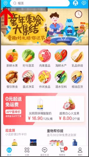 1、首先打開盒馬App,點(diǎn)擊左上角的定位圖標(biāo),設(shè)置好你的收貨地址。