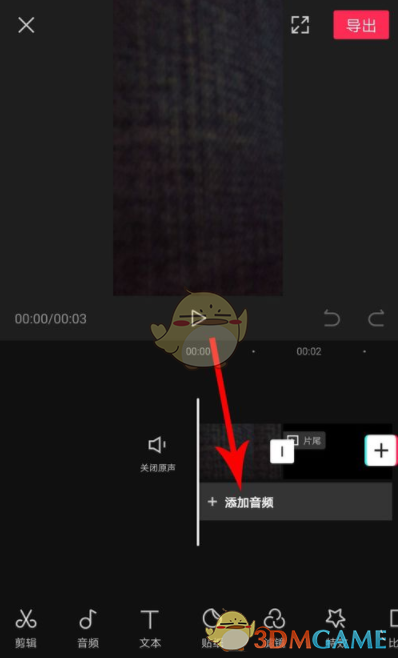 1、首先打開剪映的視頻編輯頁面,然后點擊“+添加音頻”按鈕。