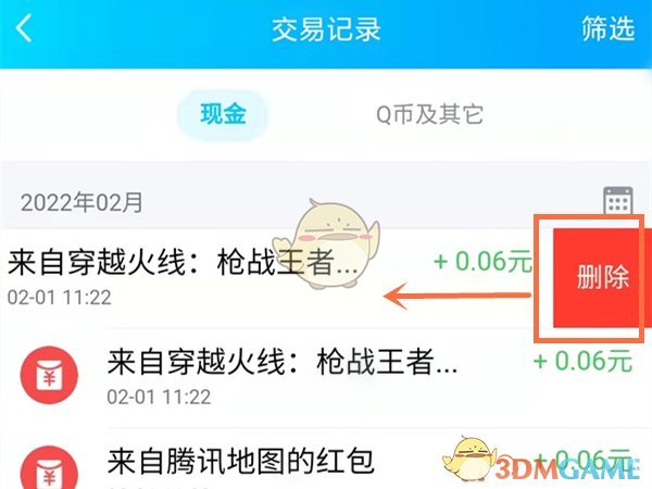 3、在交易記錄頁面,找到你想刪除的紅包、錢包提現(xiàn)或充值記錄,向左滑動并點擊“刪除”即可。