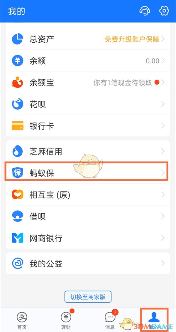 1、首先進入支付寶的“我的”頁面,點擊“螞蟻?!?。