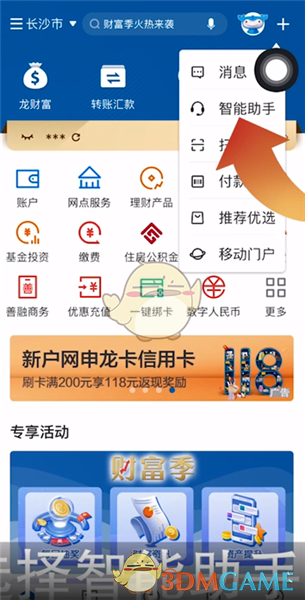 1、首先,打開中國建設(shè)銀行app,在首頁點擊右上角的加號圖標,接著選擇“智能助手”功能,