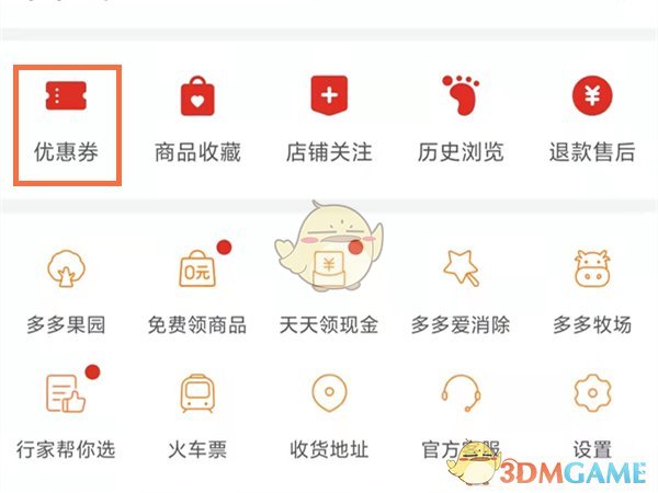 1、首先打開拼多多,進入個人中心頁面,點擊“優(yōu)惠券”選項。