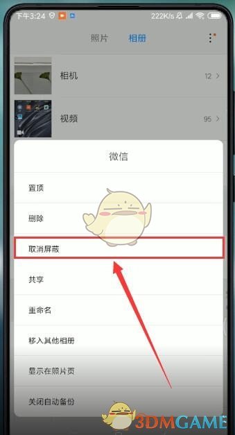 5、長按你想取消屏蔽的相冊,彈出菜單中選擇【取消屏蔽】選項,完成后就能恢復(fù)該相冊的顯示了。