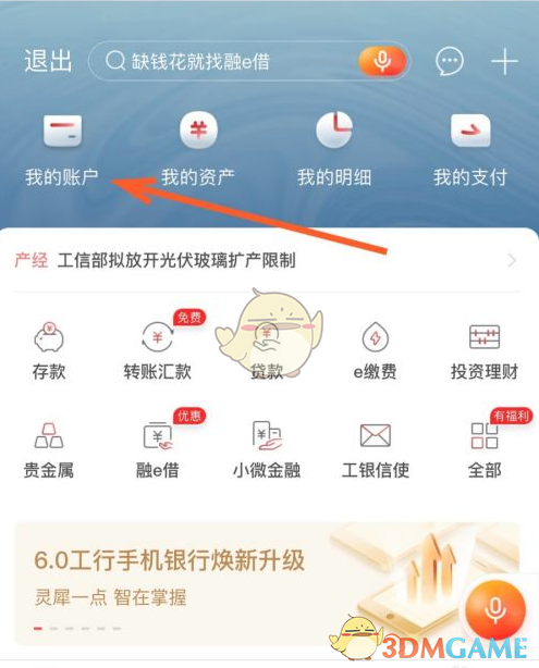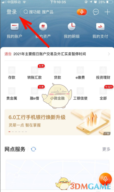 2、接著,輸入賬戶密碼,登錄到工行的手機(jī)銀行界面。