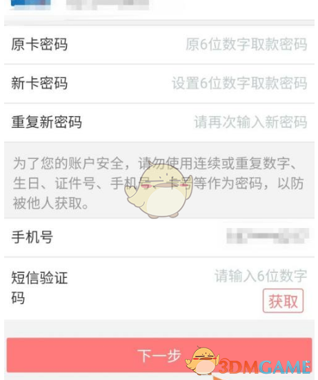 4、輸入當(dāng)前密碼后,設(shè)置一個(gè)新的密碼,獲取短信驗(yàn)證碼并輸入,點(diǎn)擊“下一步”完成修改。