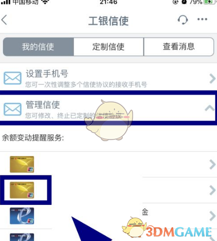 4、進(jìn)入工銀信使界面后,點(diǎn)擊【管理信使】選項(xiàng),并選擇你要取消短信提醒的銀行卡;