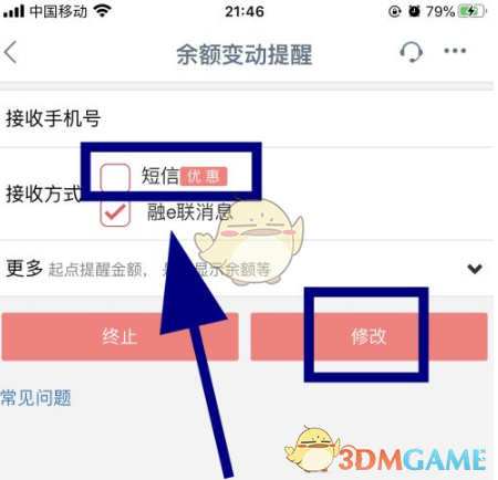 5、在信使設(shè)置頁面中,將【提醒方式】中的【短信】選項(xiàng)取消,并點(diǎn)擊【修改】;