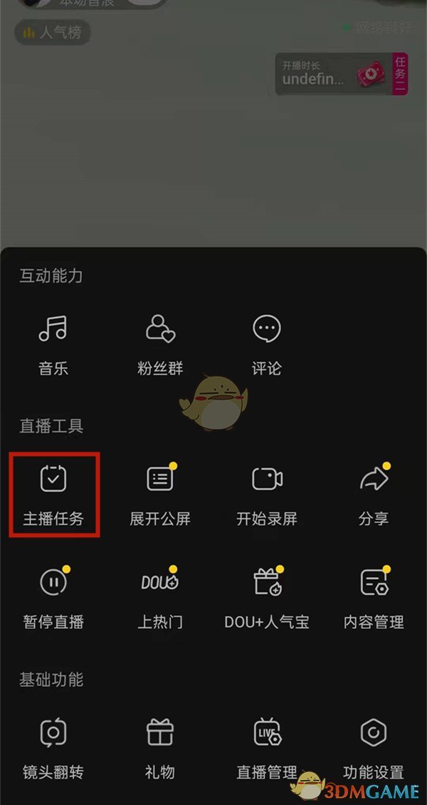 4、在彈出的菜單中選擇“主播任務(wù)”選項(xiàng)。
