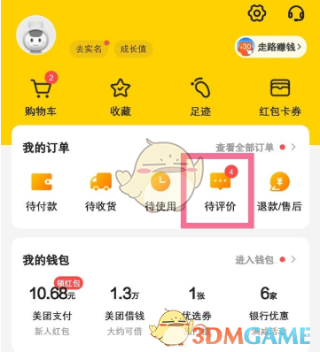 1、首先,打開美團APP,進入“我的”頁面并點擊【待評價】。