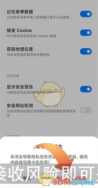 4、在彈出的窗口中,點擊“繼續(xù)”并確認接受風險,這樣就能成功關閉安全檢測功能。