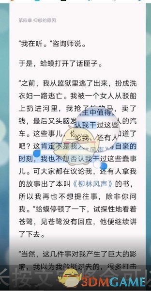 2、選擇一本書籍后,長按正文中的任意文字,即可選中該文字。