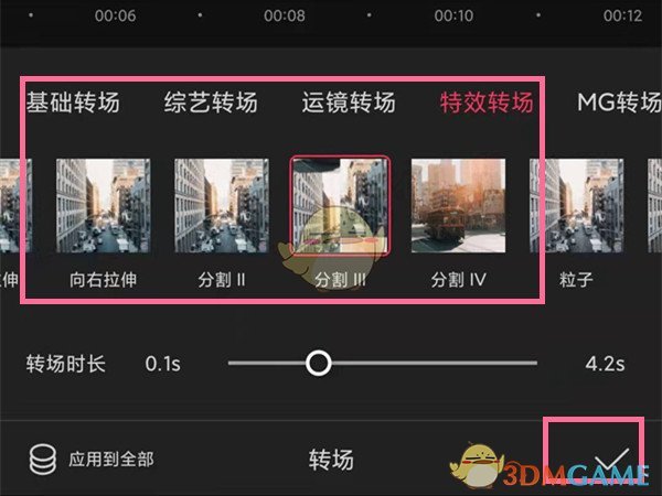 3、進(jìn)入轉(zhuǎn)場(chǎng)設(shè)置界面后,選擇一個(gè)轉(zhuǎn)場(chǎng)效果,使兩段視頻順暢地拼接在一起。