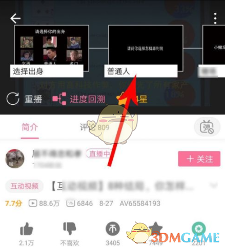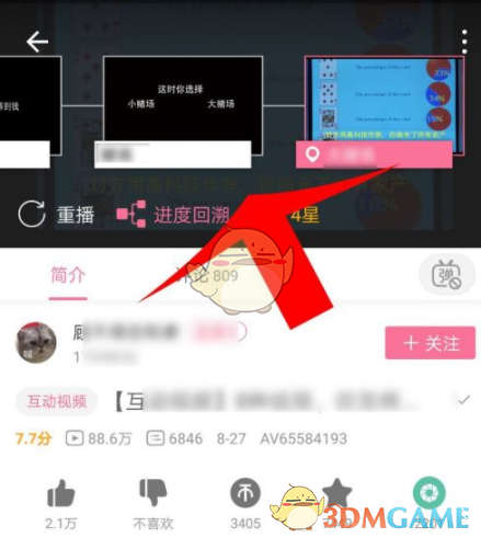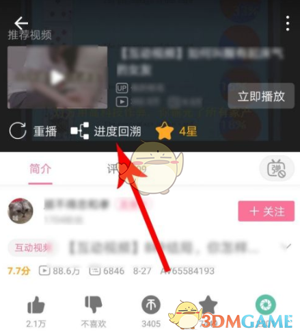 1、首先需要在b站上為互動(dòng)視頻評(píng)分,評(píng)分后點(diǎn)擊“進(jìn)度回溯”按鈕。