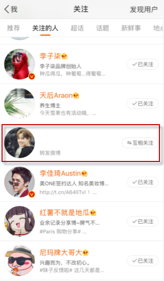 2、在顯示關(guān)注的人列表中,找到并點(diǎn)擊你想查看關(guān)注超話的好友;