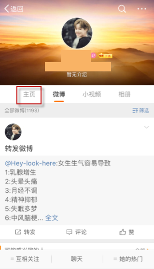3、進(jìn)入該用戶(hù)的微博首頁(yè)后,點(diǎn)擊“主頁(yè)”按鈕;