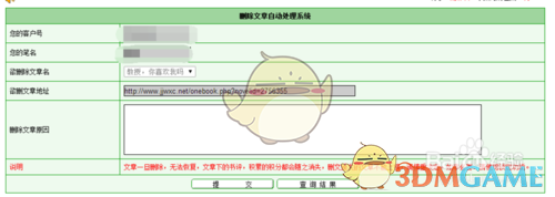 4、點擊后,你需要填寫刪除文章的理由。認(rèn)真填寫后,點擊提交。