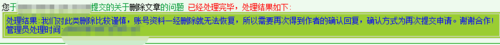 7、一般來說,管理員會同意你的刪除請求。如果未同意,你可以再次提交刪除申請。需要注意的是,管理員給出的反饋通常是讓你再次申請刪除,具體反饋如下圖所示。