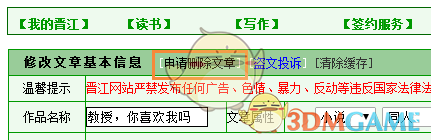 3、進入文章更新頁面后,你可以看到一個“申請刪除文章”的選項。