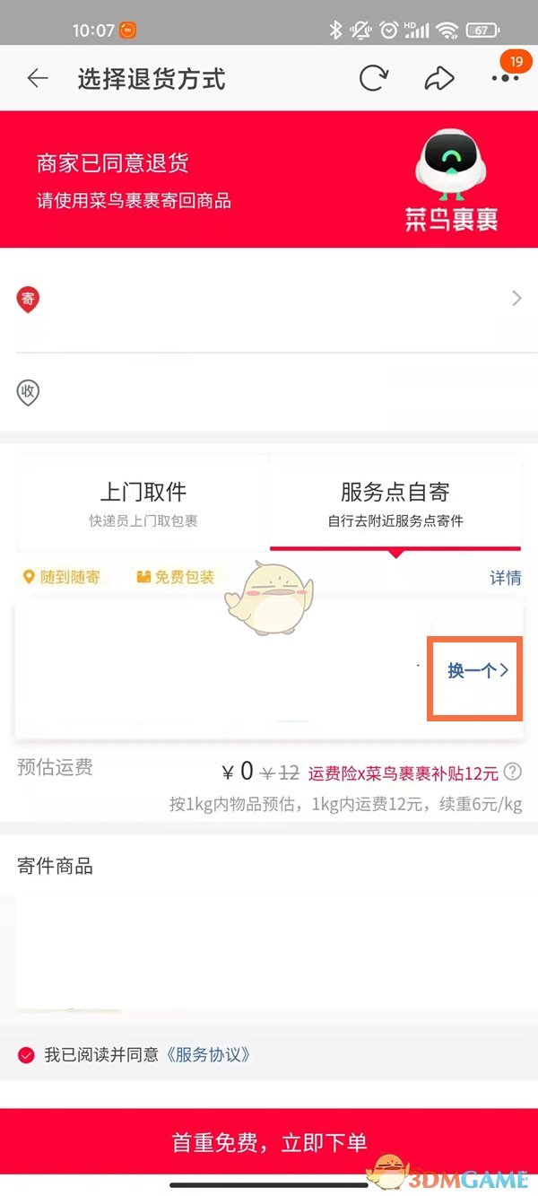 3、在新頁(yè)面中,選擇“服務(wù)點(diǎn)自寄”,然后在寄件點(diǎn)的右側(cè)點(diǎn)擊“更換”,選擇你想寄件的地點(diǎn)即可。