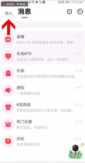 1、首先,打開唱吧APP,進(jìn)入首頁后點(diǎn)擊消息選項(xiàng),然后在左上角找到并點(diǎn)擊“找人”按鈕。