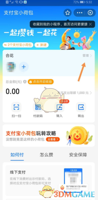 1、首先打開支付寶的小荷包,點(diǎn)擊頁面上的“管理”按鈕。