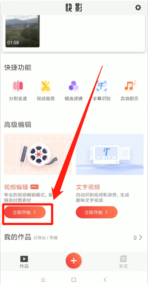 1、首先打開【快影】應(yīng)用,在主頁(yè)面點(diǎn)擊視頻編輯區(qū)域下方的【立即開始】按鈕;