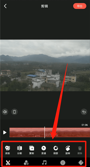 3、在編輯頁(yè)面中,根據(jù)需求在頁(yè)面下方的功能選項(xiàng)中完成視頻與圖片的合成操作;