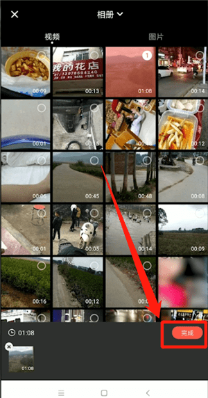 2、接著選擇你想要編輯的視頻,選好后點(diǎn)擊頁(yè)面底部的【完成】按鈕,進(jìn)入編輯界面;