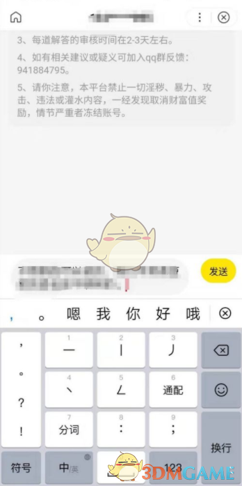 4、在答題窗口中輸入你的答案,并點擊下方的“發(fā)送”按鈕,即可完成回答。