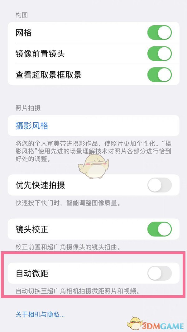 2、在相機(jī)設(shè)置界面,關(guān)閉【自動(dòng)微距】選項(xiàng)右側(cè)的開關(guān)即可。