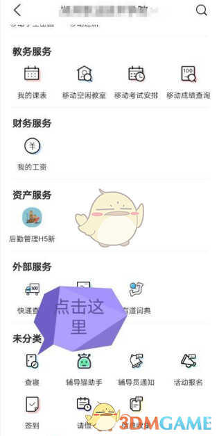 2、進入“我的大學”頁面后,往下滑動并找到“查寢”選項。