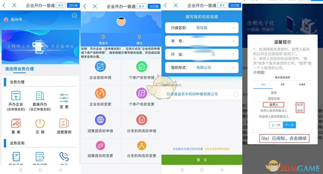 2、點(diǎn)擊“開辦企業(yè)”進(jìn)入“企業(yè)名稱申報(bào)”頁面,填寫企業(yè)名稱、公司類型等信息,并點(diǎn)擊“提交”。選擇登記機(jī)關(guān)為“濱州市市場監(jiān)督管理局”,并填寫投資人信息,完成企業(yè)名稱的自主申報(bào)。