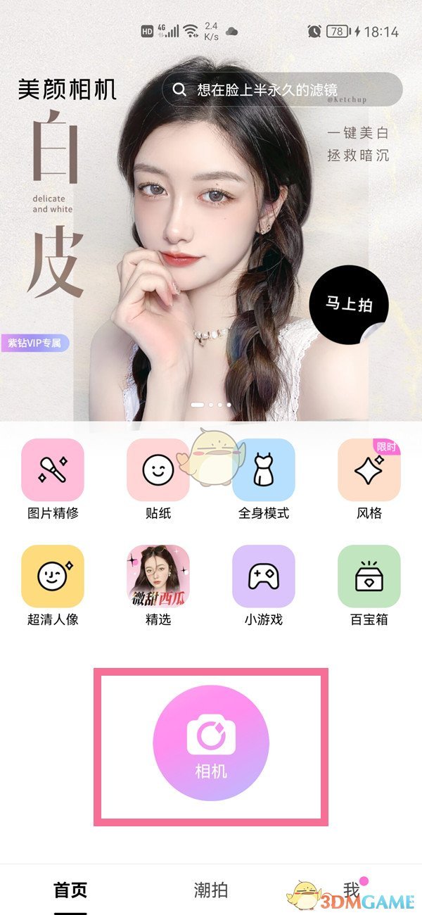 1、首先打開美顏相機(jī)APP,進(jìn)入拍照界面,點(diǎn)擊【相機(jī)】。