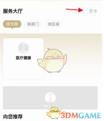 3、接下來,點擊頁面左下角的“首頁”右側(cè)的“辦事”按鈕,進入“服務(wù)大廳”,然后點擊“更多”以進入進一步的服務(wù)選項。
