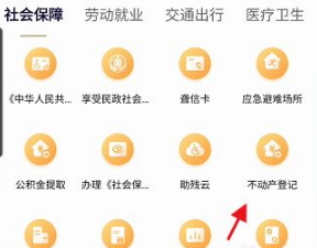 在“更多服務(wù)”頁面中,找到“社會保障”部分,點擊下方的“不動產(chǎn)登記”選項進入。