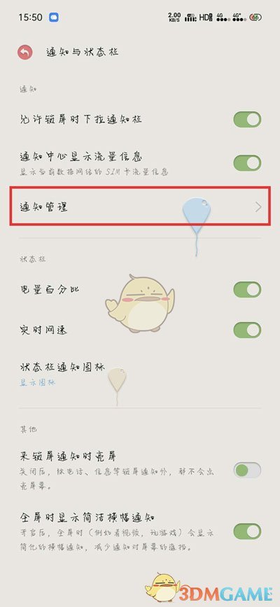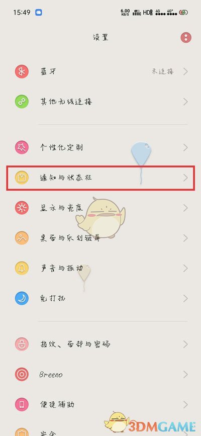 2、在設(shè)置頁(yè)面中找到并點(diǎn)擊【通知與狀態(tài)欄】;