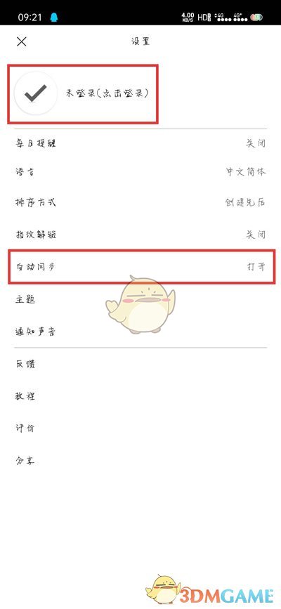 3、在設(shè)置頁(yè)面中,點(diǎn)擊上方的【未登錄】按鈕進(jìn)行登錄或注冊(cè)賬戶,然后選擇【自動(dòng)同步】選項(xiàng);