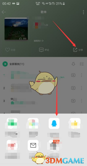 5、點擊歌單旁的分享按鈕,推薦選擇QQ分享方式,并將歌單鏈接發(fā)送到你的電腦。