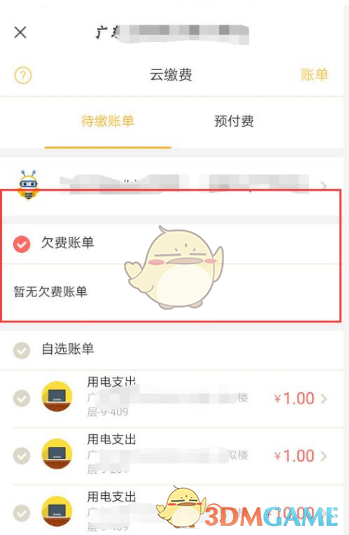 2、進(jìn)入主界面后,找到并點(diǎn)擊【繳費(fèi)】功能,然后在【待繳費(fèi)】列表中查看自己需要支付的水電費(fèi)。