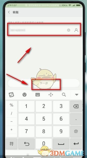3、接下來,輸入收款方的小米賬號或手機(jī)號碼,并填寫轉(zhuǎn)賬金額,點(diǎn)擊下一步繼續(xù)。
