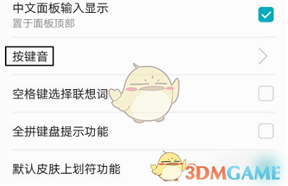 2、此時,在鍵盤下方會顯示出常用功能,向下滑動,找到“按鍵音”選項,點擊進入后,你會看到當(dāng)前狀態(tài)為“默認(rèn)”。